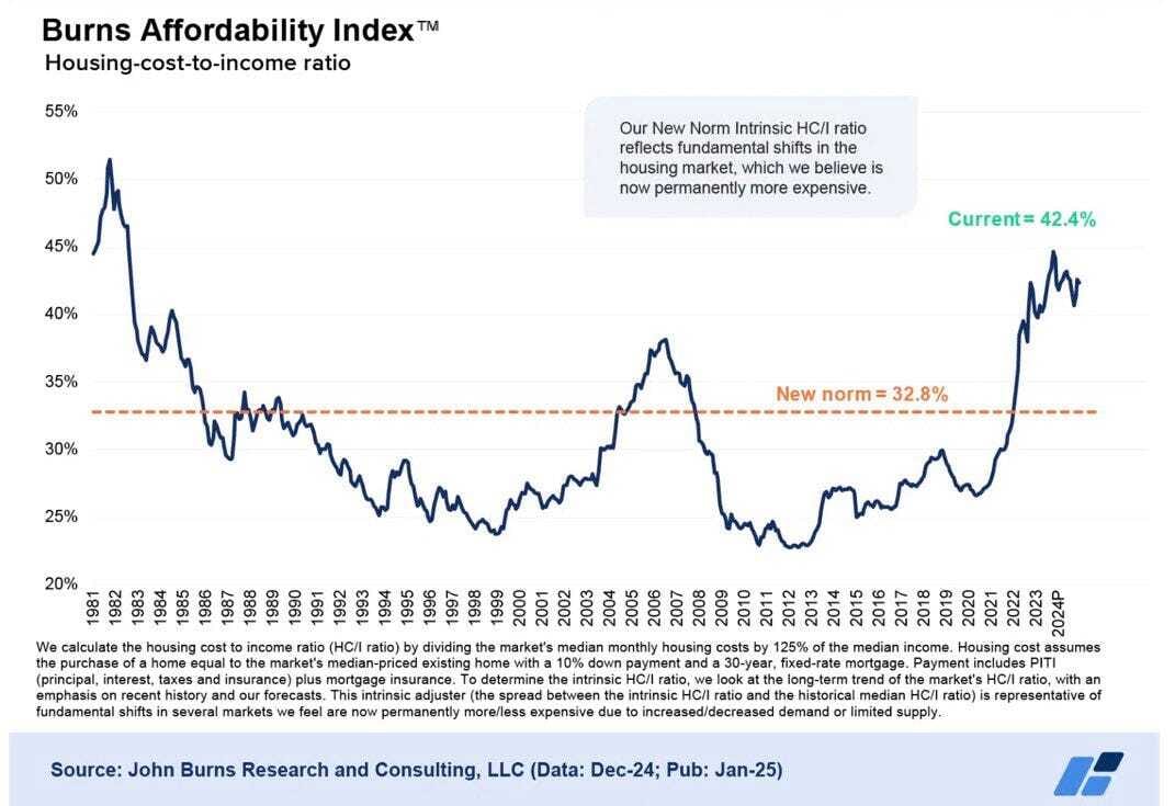 As a result, prices spiked. The average age of first-time homeownership is now 40 years old, and home prices spiked 40%+ since 2020, so quickly that we are back above 2006 affordability levels (see below).