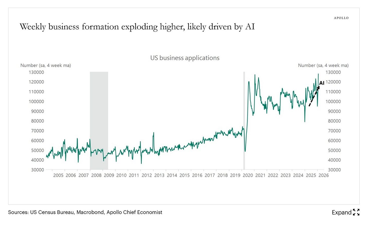 New Business Formation Exploding Higher! AI is making it easier than ever to start your own business (Apollo).