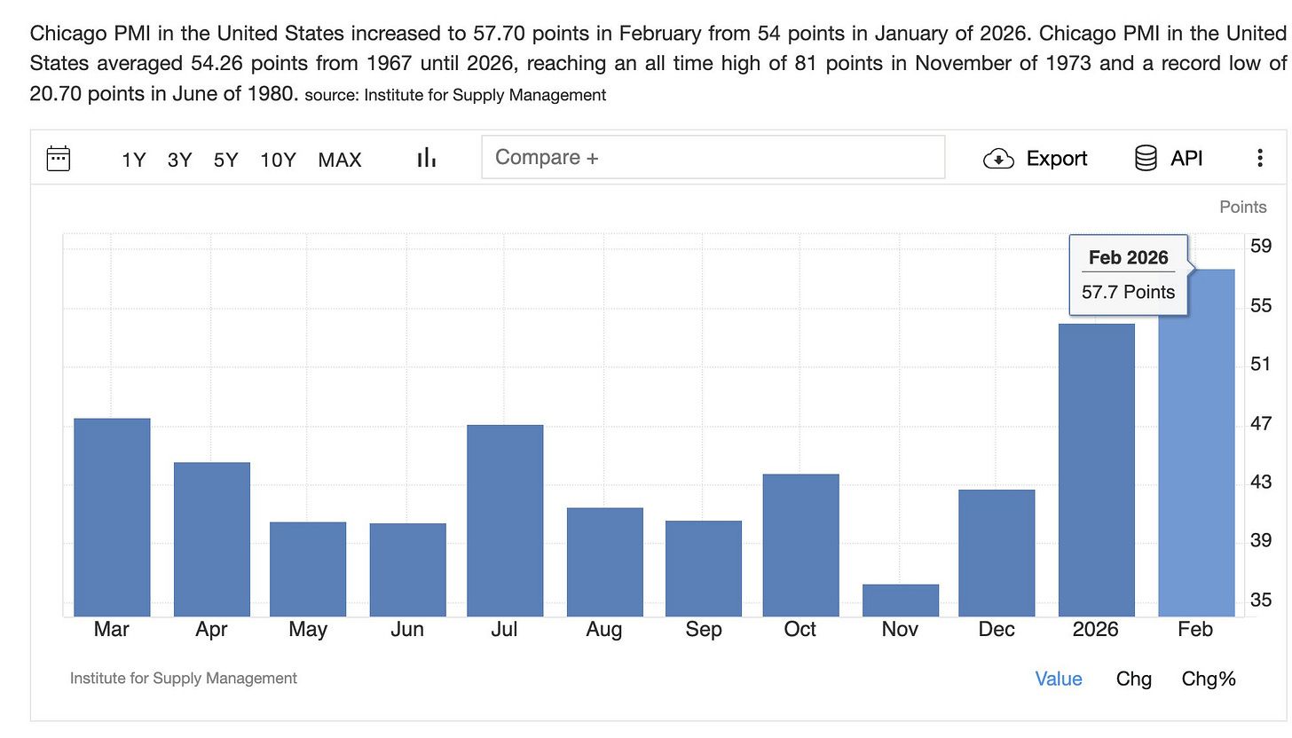 Last week, Chicago PMI (a survey of manufacturers) printed 57.7 vs 52.1 expected, up from 54.0.
