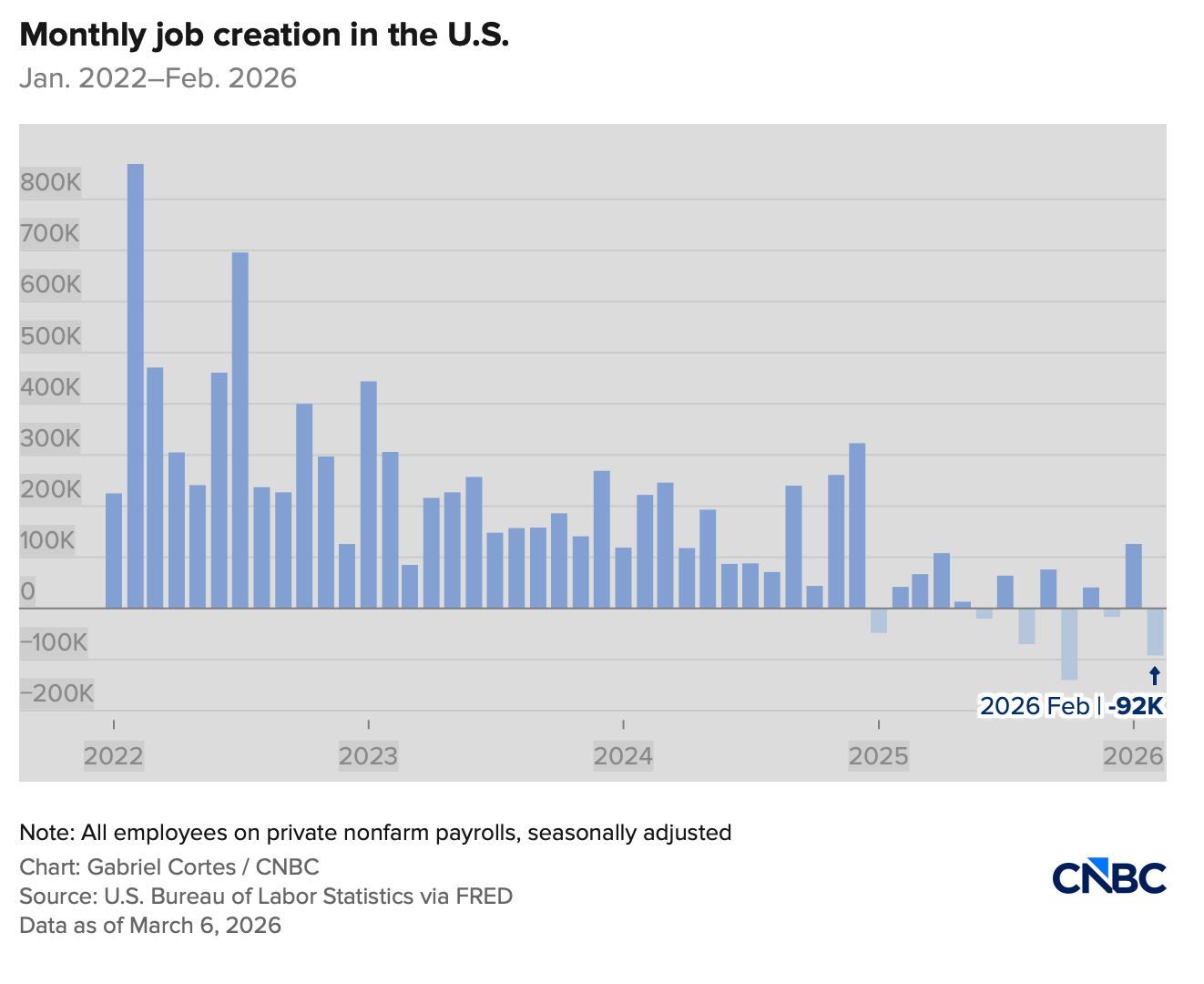 The BLS data showed a loss of 92,000 jobs, vs of 50k as expected, and far below the quite encouranging number of +126k in January.