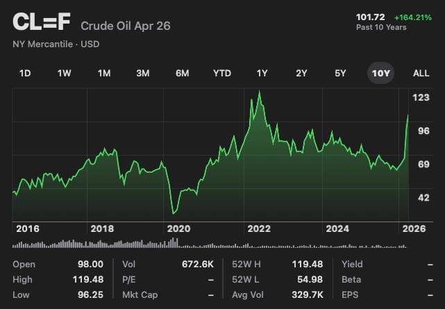Here is a 10-year chart of oil prices, for context.